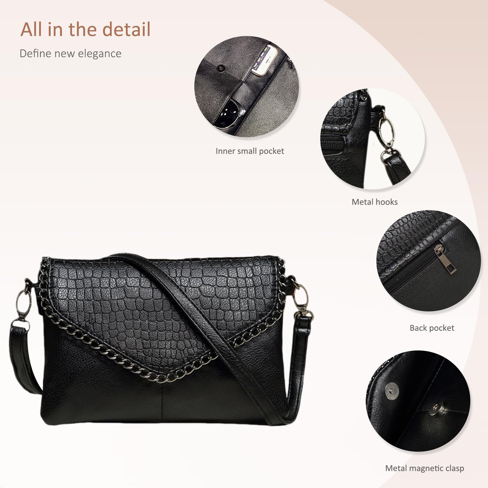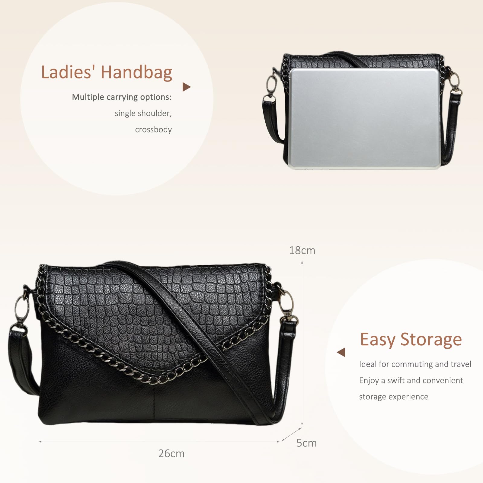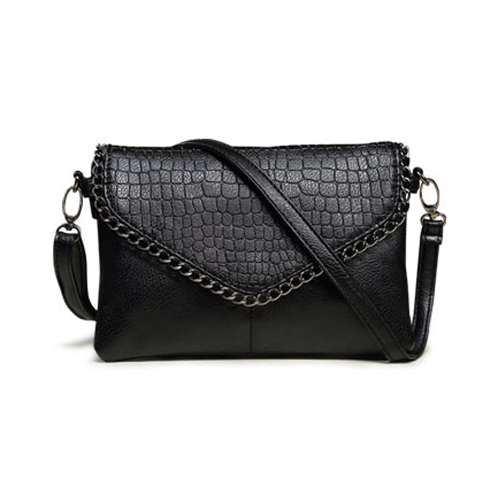 This small crossbody purse features a sleek black design with a stylish crocodile-embossed flap and decorative chain trim for a modern, edgy look. The lower panel has a smooth pebbled texture that adds contrast and depth, while the compact silhouette makes it easy to carry for daily outings or evening use. Measuring 26 x 5 x 18 cm (L x W x H) and weighing only 0.34 kg, this bag is lightweight and practical without sacrificing storage. It includes 2 front pockets, 1 back zippered pocket, and 3 open compartments, offering convenient space to organize your money, keys, lip gloss, phone, cards, and other small essentials. A chic choice for shopping, travel, casual outings, and everyday wear.