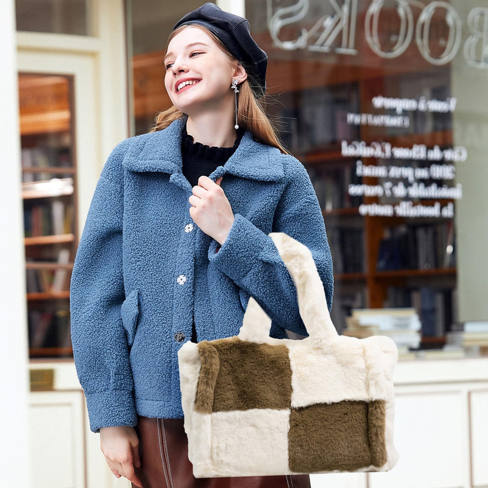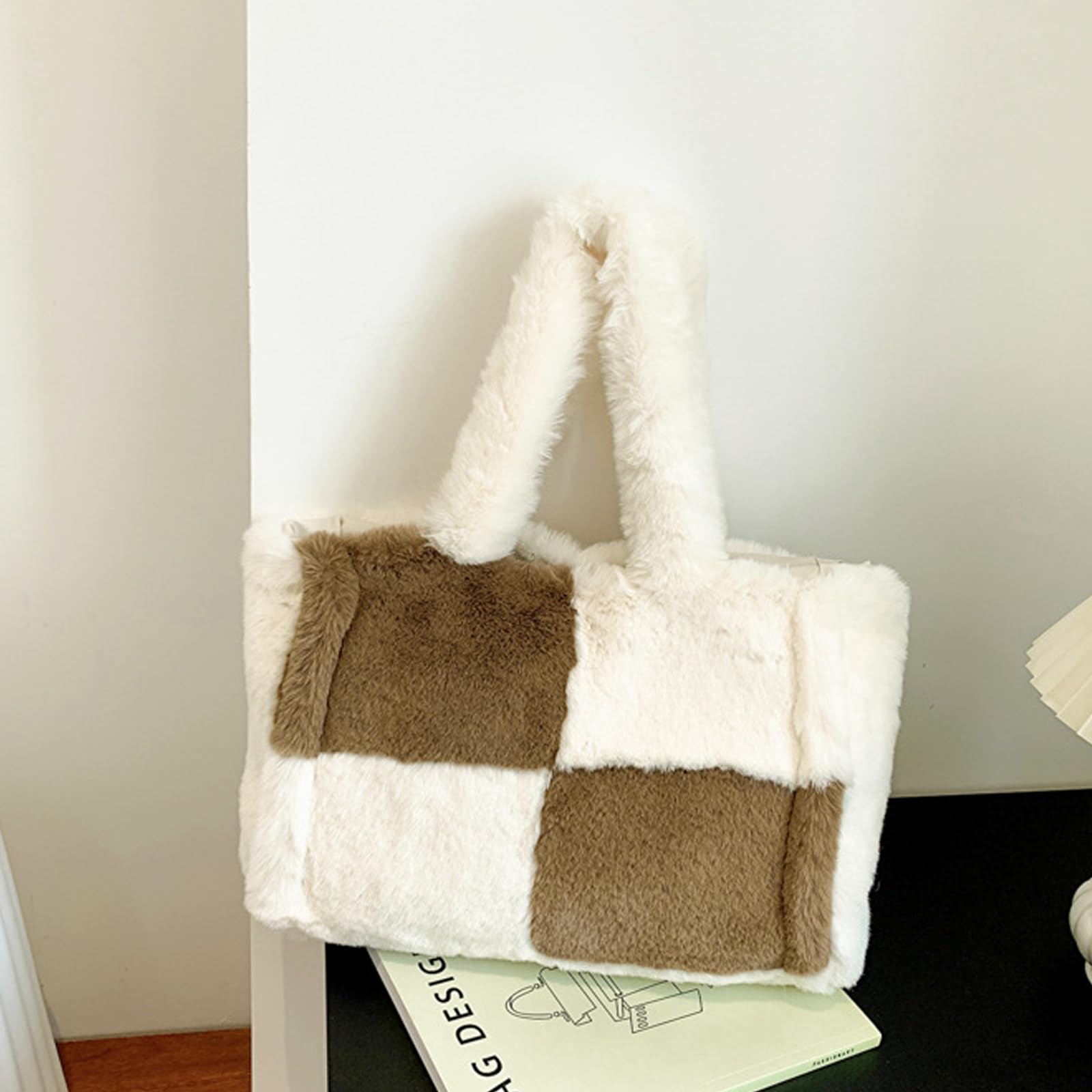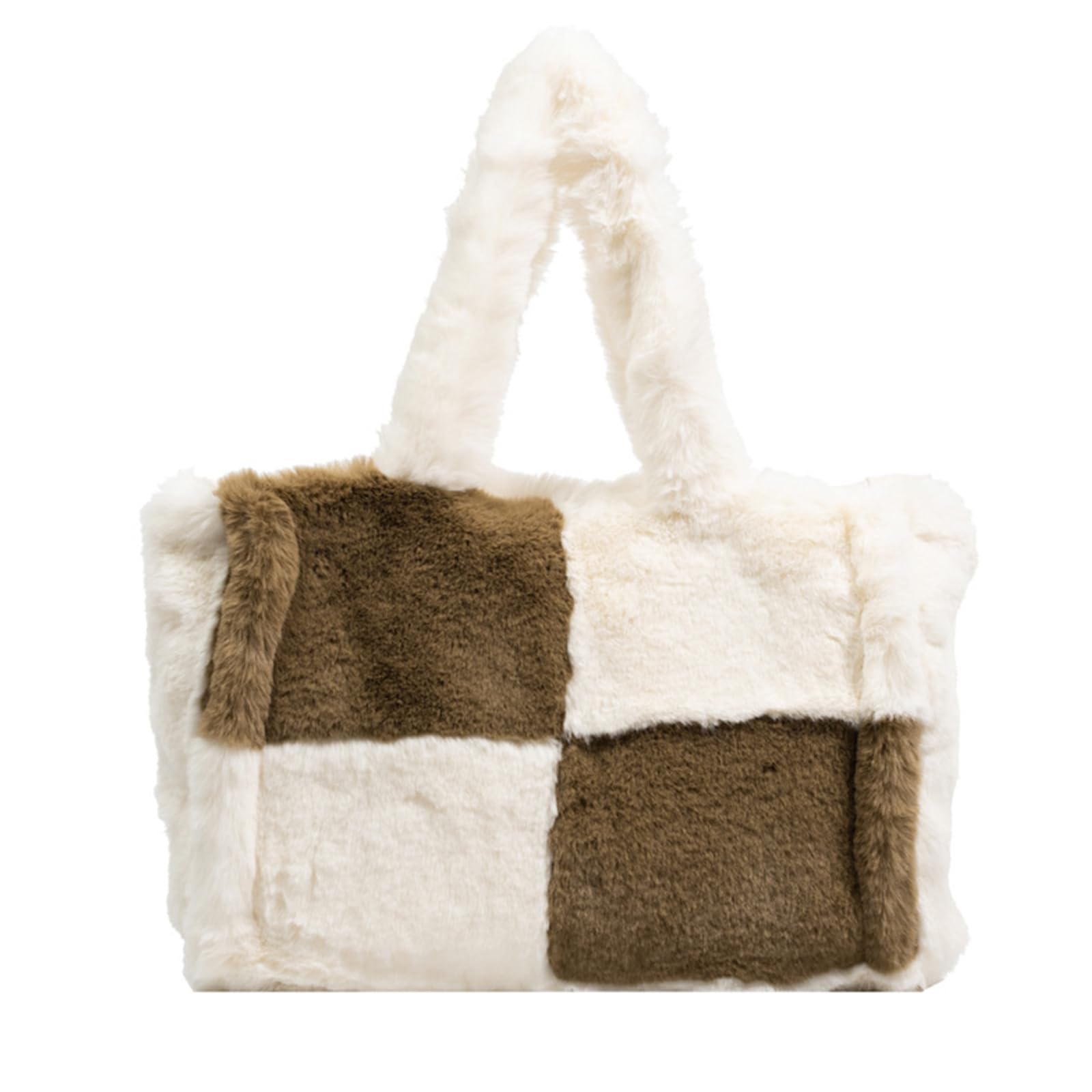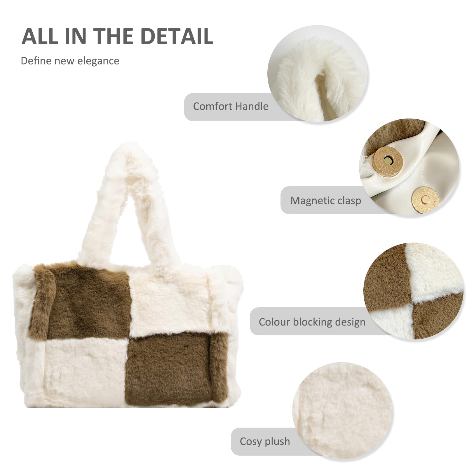 This cozy tote shoulder bag features a soft faux fur finish in a warm brown and cream patchwork design, giving it a playful yet stylish winter-ready look. The plush texture adds a comfortable, fluffy feel, while the spacious silhouette makes it practical for daily use. Designed with sturdy shoulder handles and a roomy interior, this bag is large enough to carry your mobile phone, wallet, cosmetic bag, tablet, and other commonly used essentials with ease. Measuring 45 x 10 x 27 cm (L x W x H) and weighing 0.53 kg, it offers generous storage without feeling overly heavy. A charming choice for daily outings, shopping, casual travel, and autumn or winter styling.