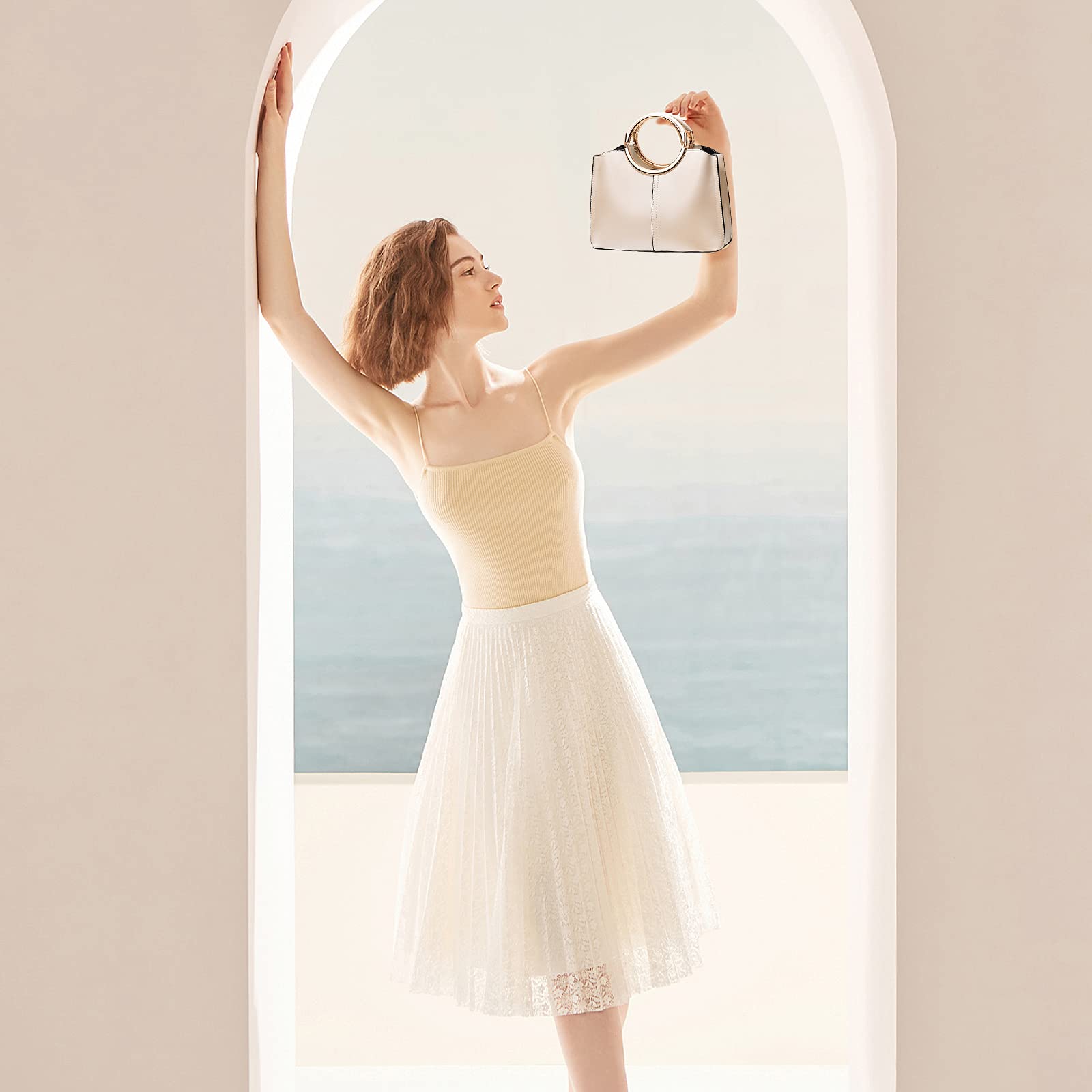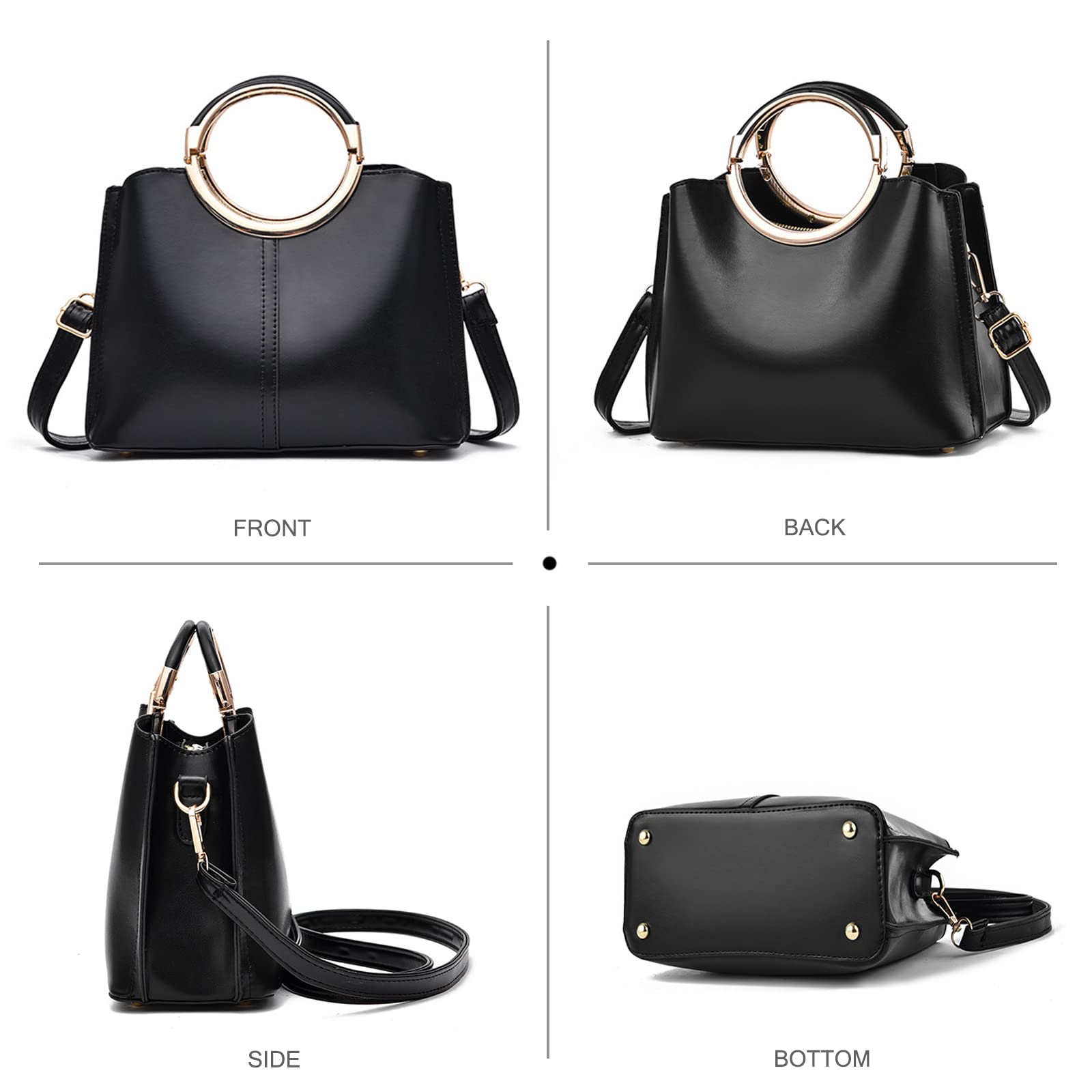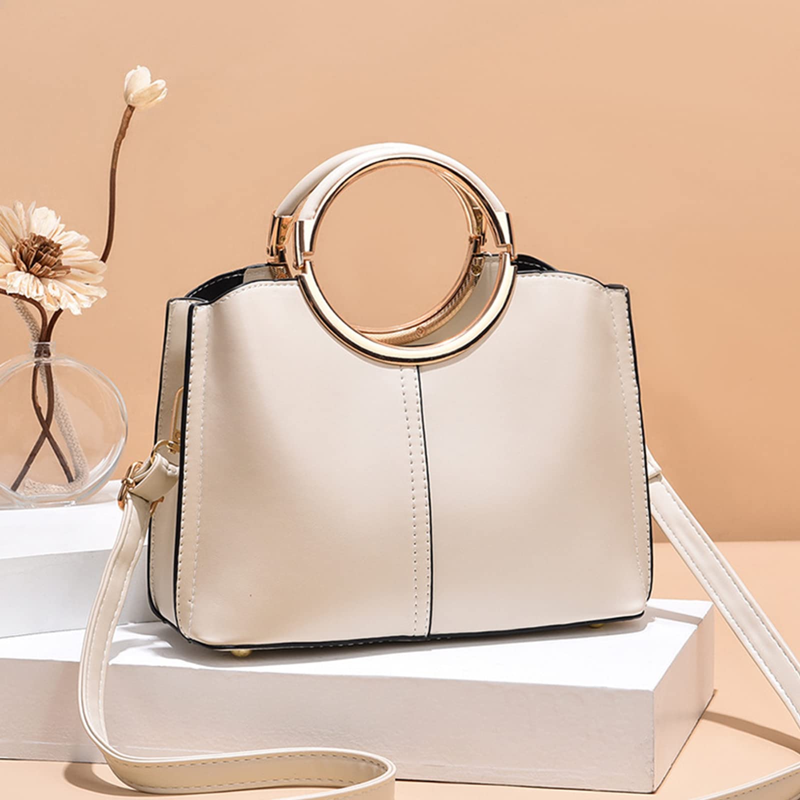 This elegant handbag features a clean structured shape in a soft champagne beige tone, giving it a modern and refined look that is easy to pair with both casual and dressy outfits. The standout double ring handles in a polished gold-tone finish add a fashionable sculptural touch, while the smooth body and minimal front seam keep the design sleek and sophisticated. Small, lightweight, and practical, this bag measures 23 cm (9.1″) L x 10 cm (3.9″) W x 18 cm (7.1″) H, with a handle height of 10 cm, and weighs 0.65 kg. The interior includes three compartments, making it easier to organize your daily essentials such as your mobile phone, keys, glasses, cosmetics, and other small belongings. A stylish choice for commuting, shopping, dinners, dates, and everyday outings.