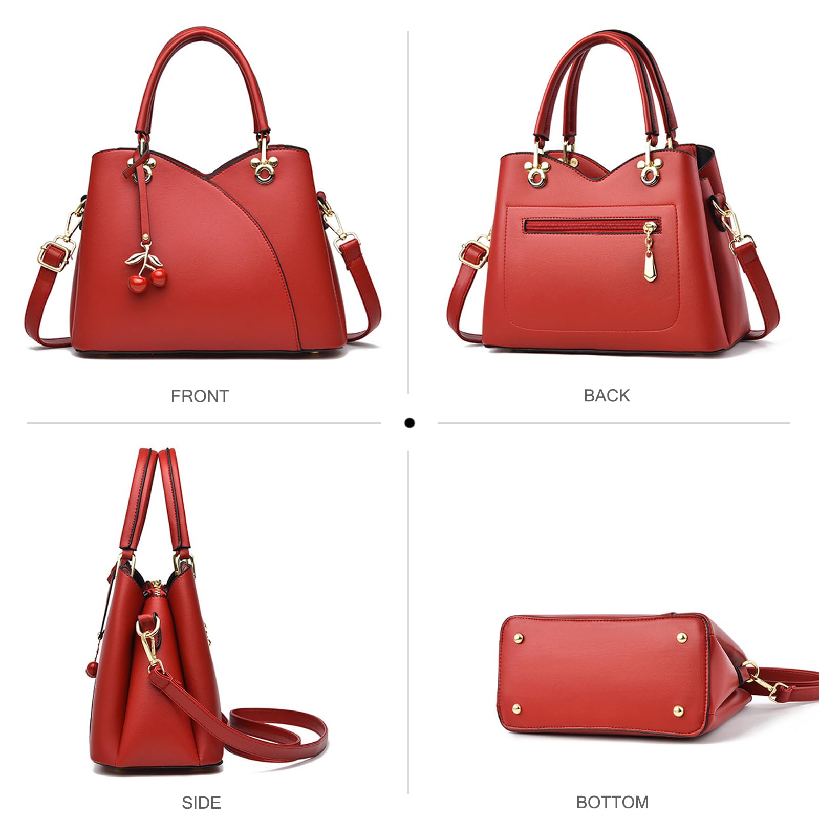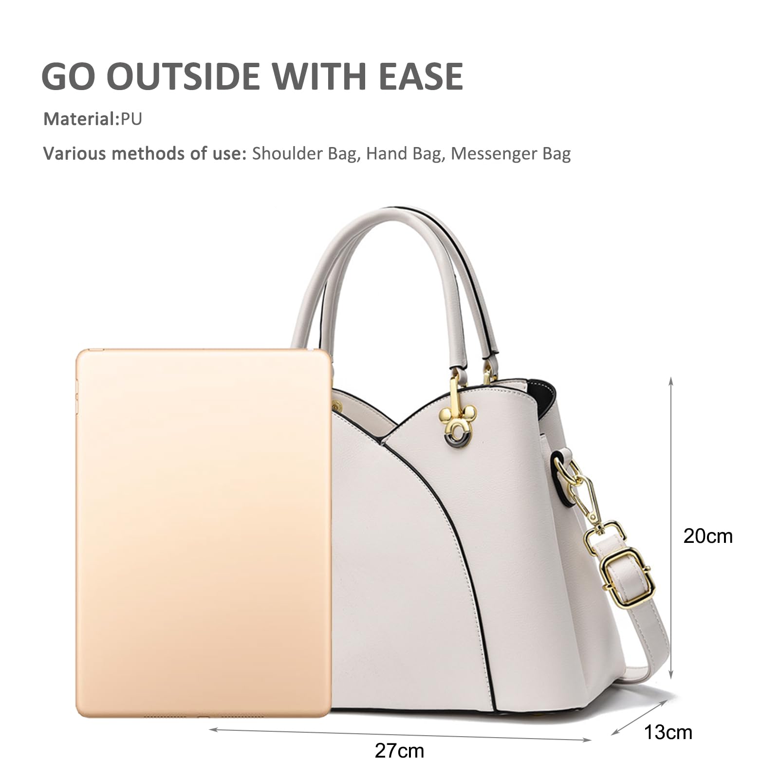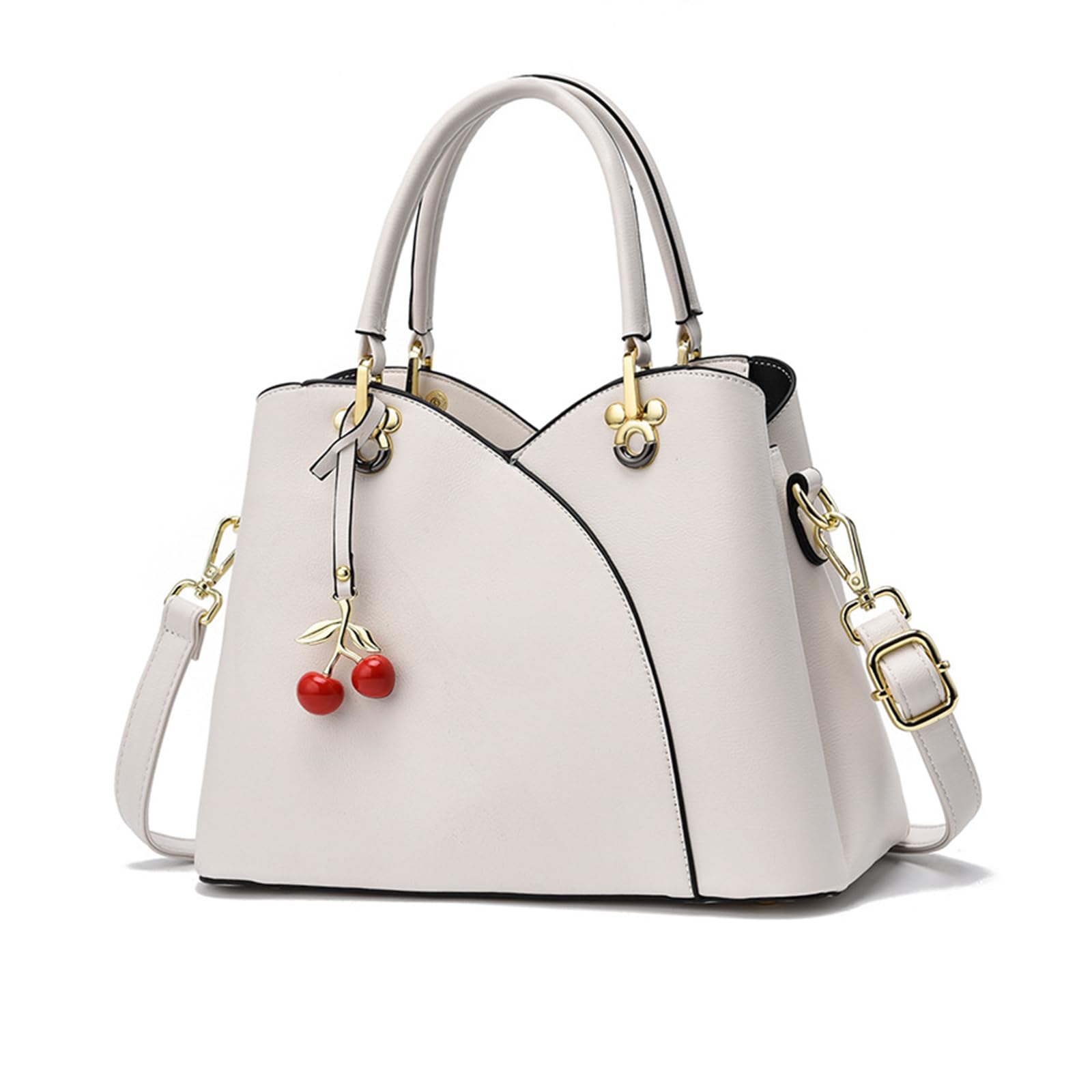 This elegant handbag features a structured silhouette in a soft cream white tone, finished with smooth curved panel lines for a clean and feminine look. The double top handles and gold-tone hardware give it a polished feel, while the playful cherry charm adds a sweet decorative touch. Designed for both style and functionality, this large crossbody bag measures 27 x 13 x 20 cm (L x W x H) and weighs 0.7 kg. It features 2 magnetic pockets, ideal for quick-access items like tickets or passports, and 1 main zippered pocket that includes 1 inner zip pocket and 1 ID pocket. The multi-pocket layout makes it easier to organize your belongings by category while keeping daily essentials neat and accessible. A stylish choice for work, commuting, shopping, travel, and everyday outings.