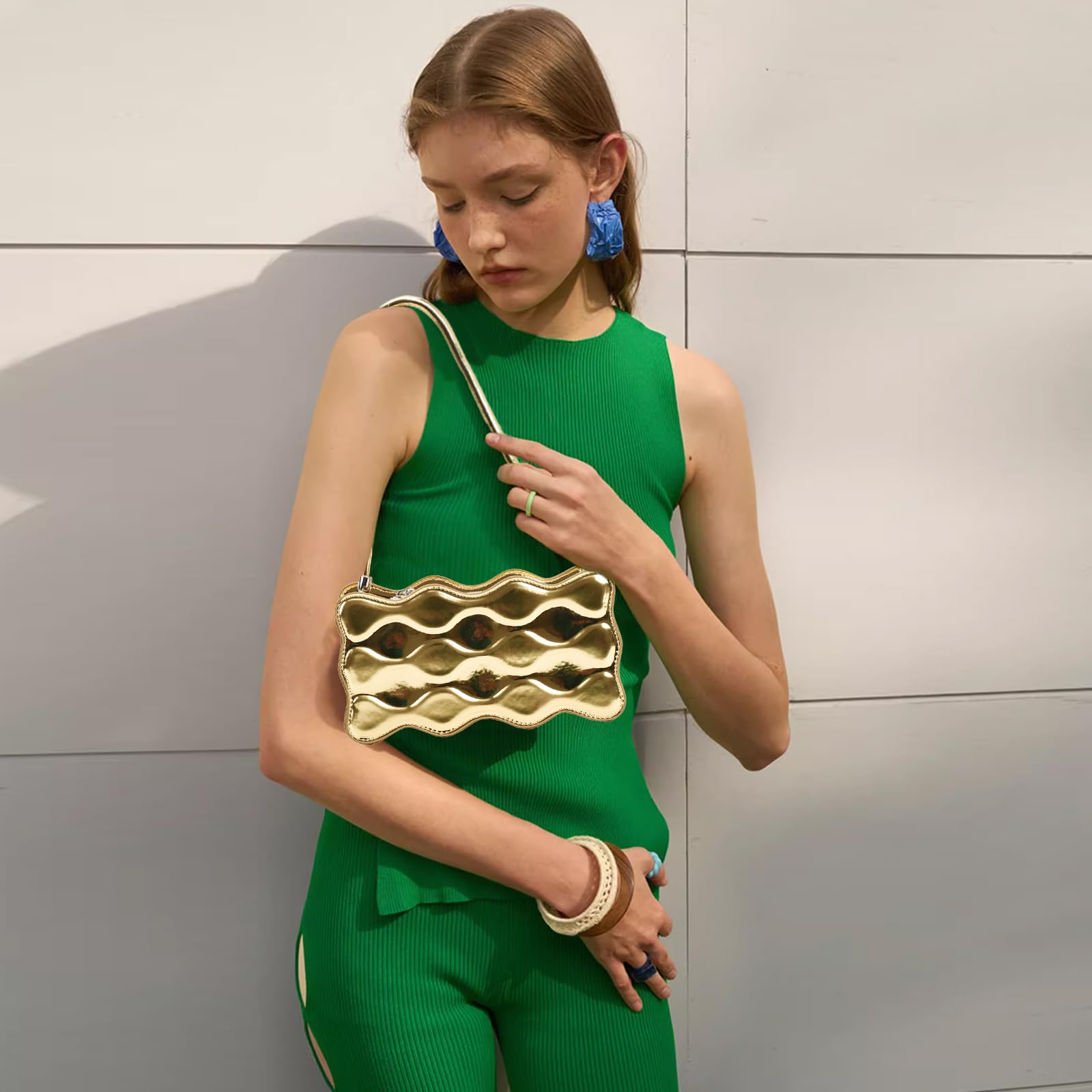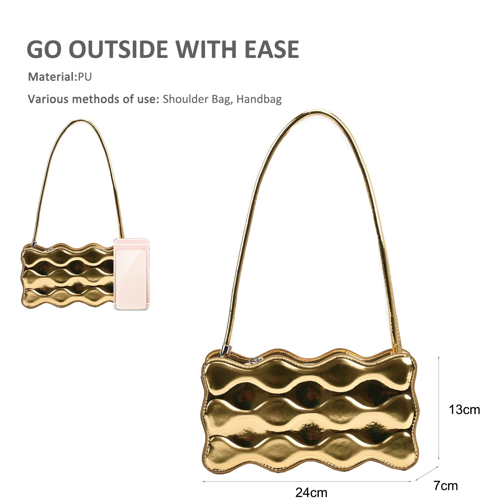 This small shoulder bag features a striking wavy layered design in a metallic gold finish, giving it a bold and fashion-forward look. The sculptural texture adds dimension and shine, making it a standout accessory for parties, dinners, vacations, street style, and special outings. Designed with a slim shoulder strap for an elegant carry, this bag is lightweight and easy to style with dresses, knitwear, or evening looks. Measuring 9.4″ L x 2.7″ W x 5.1″ H (24 x 7 x 13 cm), with a 70 cm shoulder strap length and a weight of 0.27 kg, it is just the right size for daily essentials such as your iPhone, keys, card wallet, cosmetics, and other small necessities.