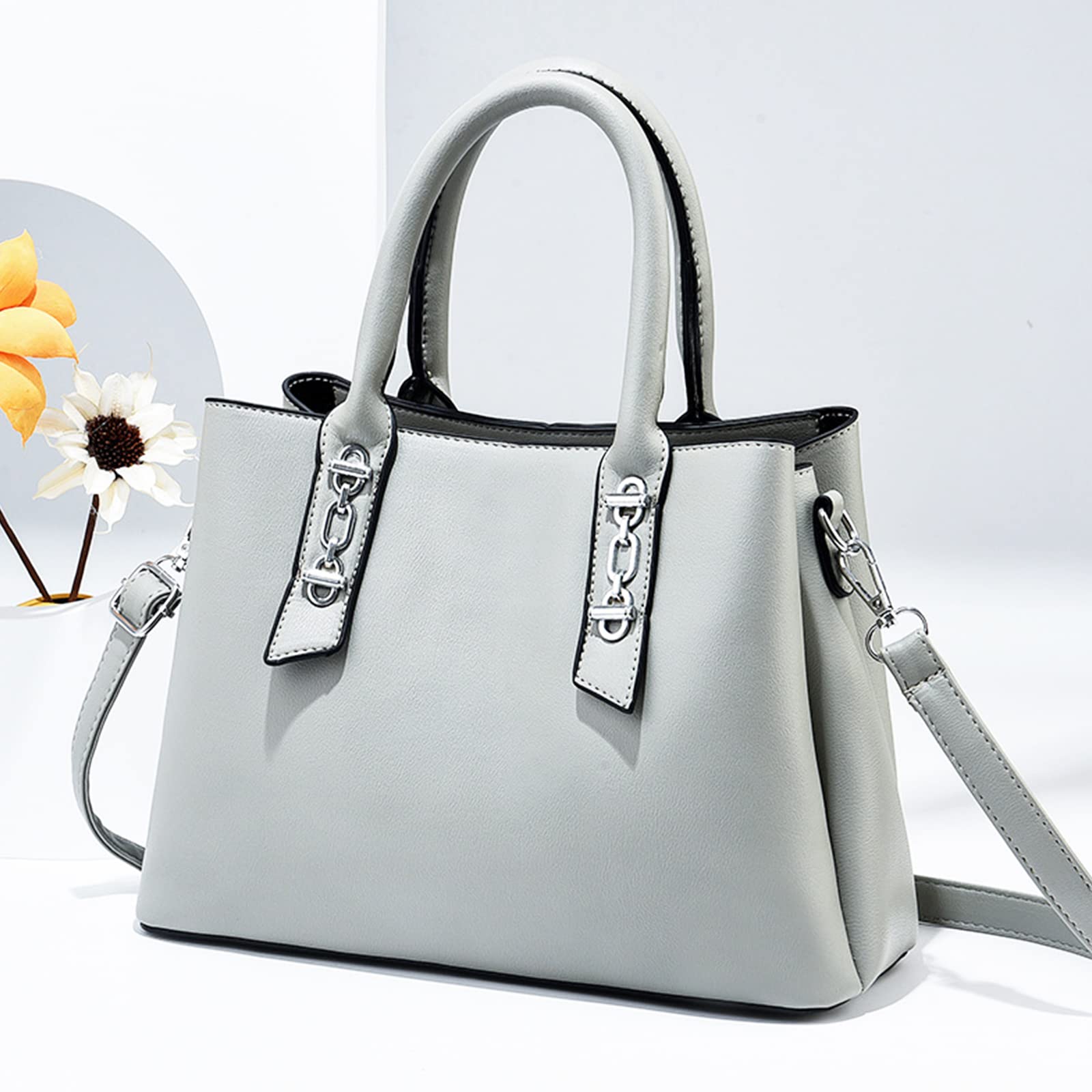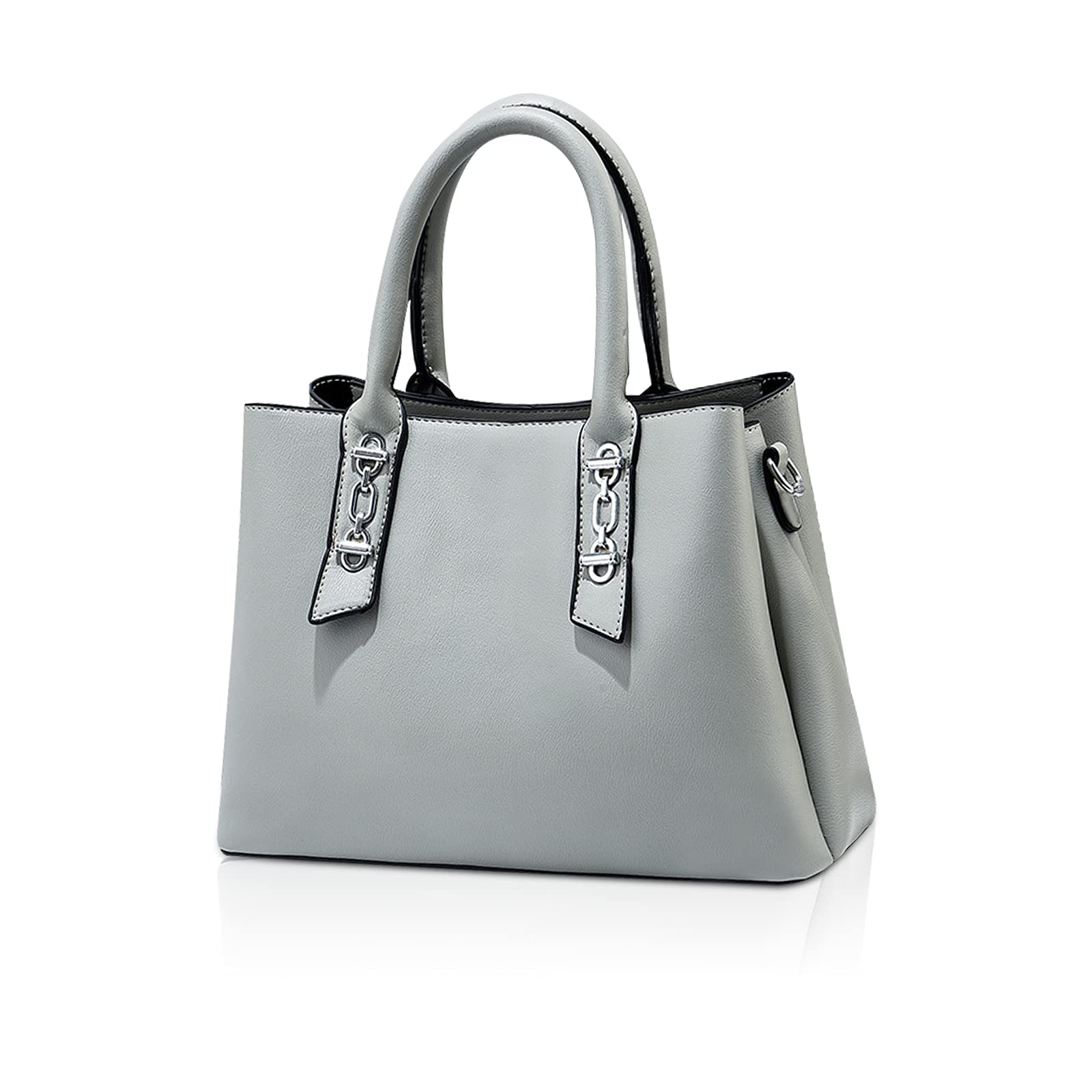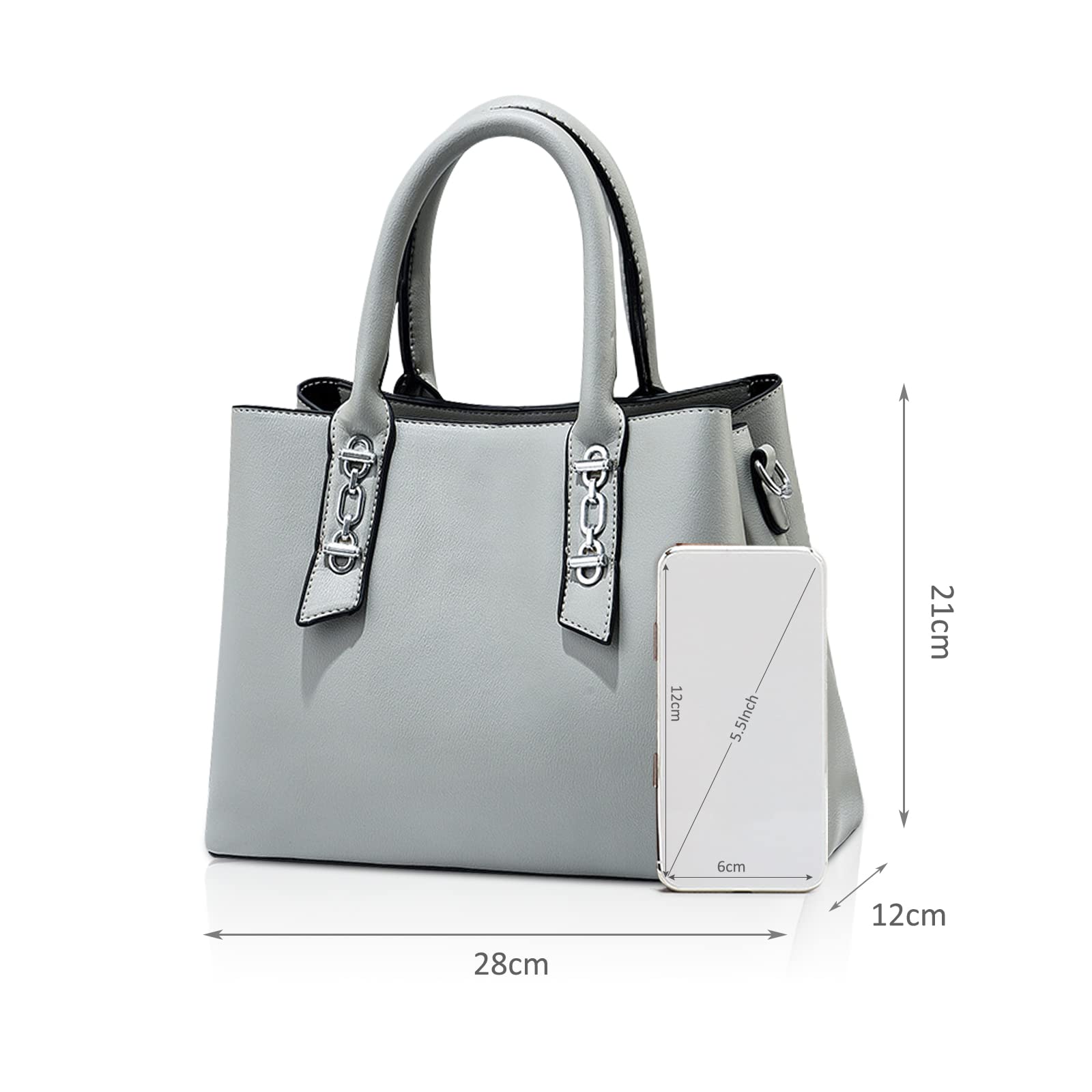 This elegant women’s handbag features a clean structured silhouette in a soft light gray tone, offering a polished and versatile look for everyday styling. The smooth textured surface is paired with double top handles and silver-tone hardware accents at the handle tabs, adding a refined modern touch. Designed to be medium-sized, lightweight, and practical, this bag measures 28 cm (11″) L x 12 cm (4.7″) W x 21 cm (8.3″) H, with a 14 cm handle height, and weighs 0.8 kg. It is spacious enough to fit most daily essentials such as your iPad, umbrella, wallet, mobile phone, cosmetics, and other personal items. A stylish choice for work, commuting, shopping, travel, and daily outings.