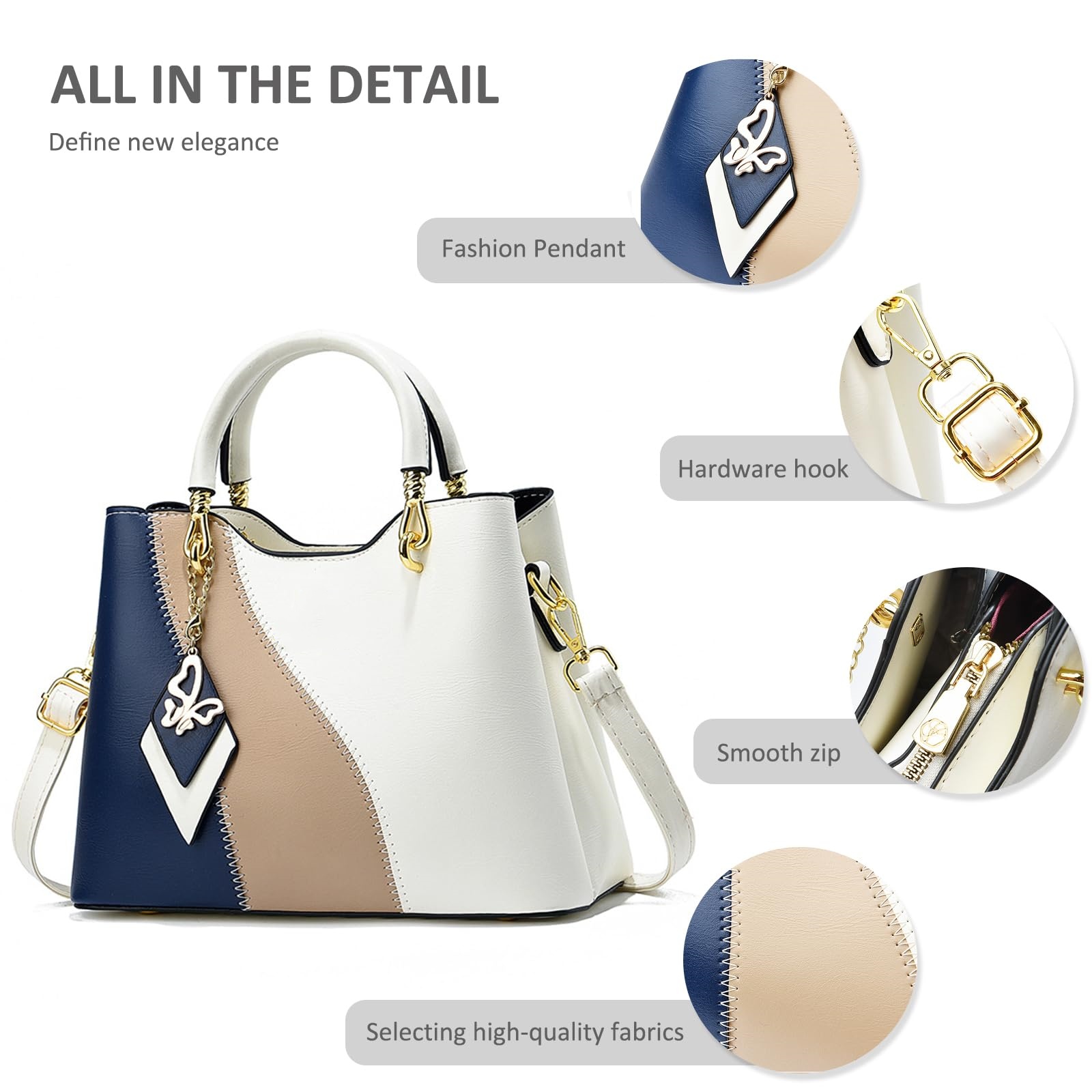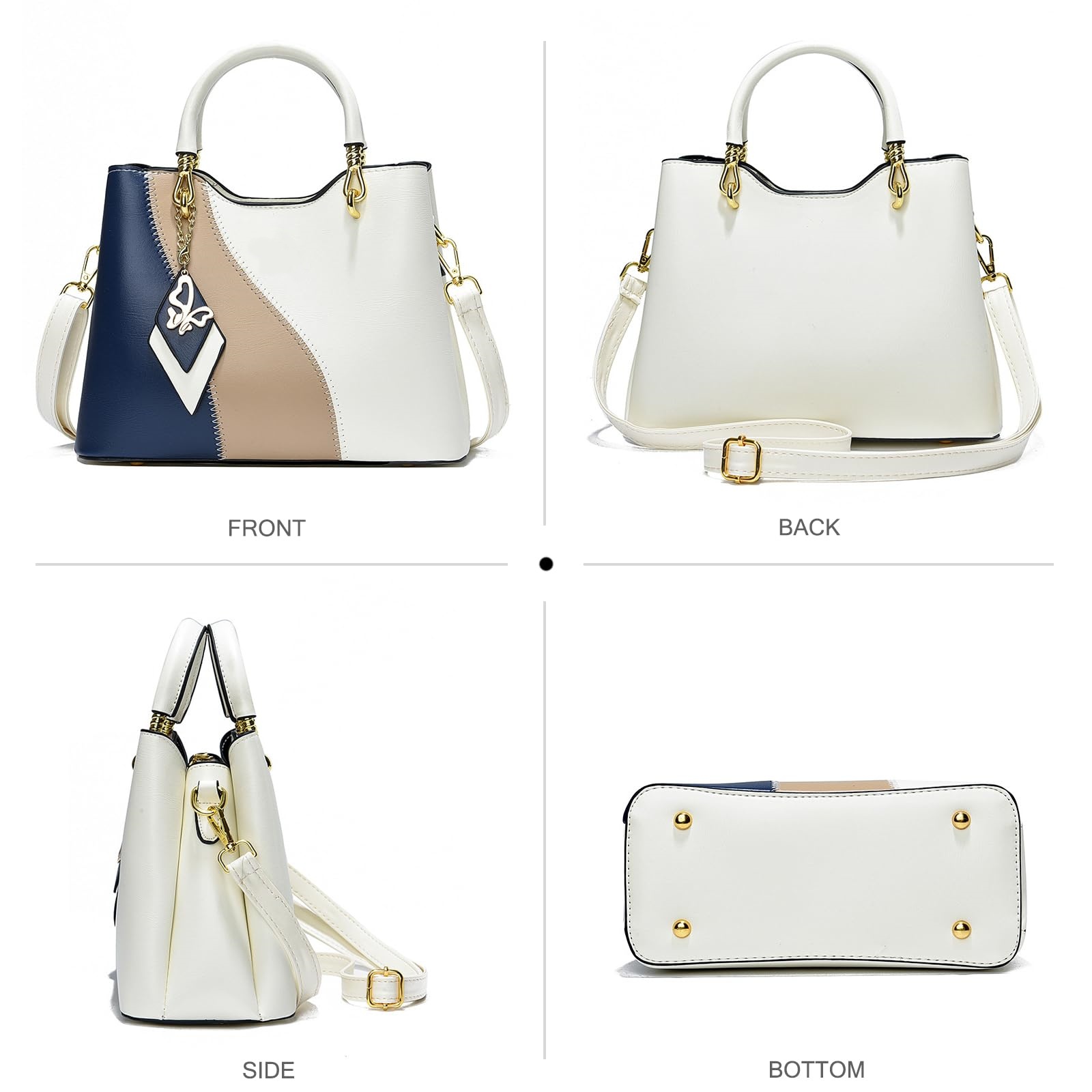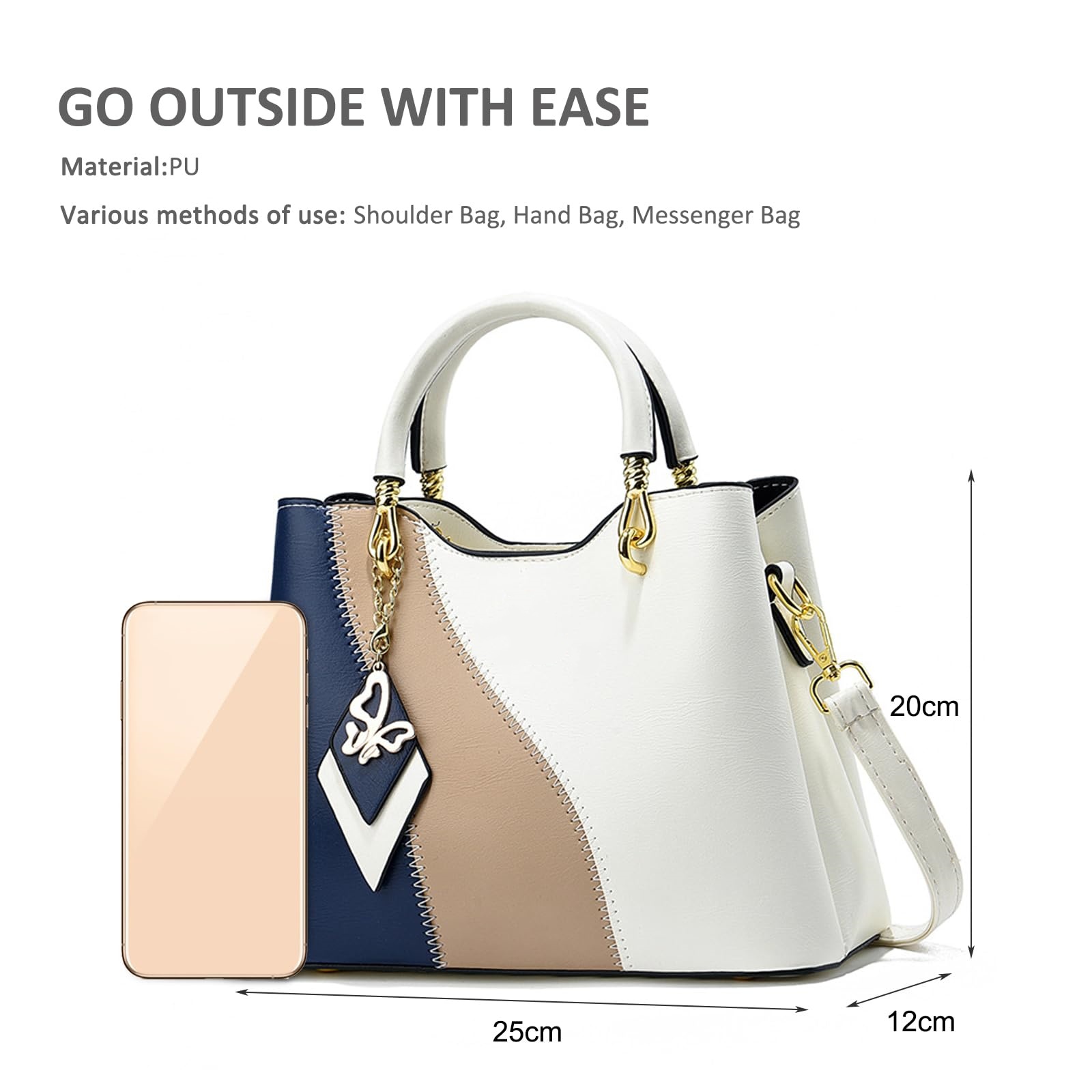 This mini handbag features a chic colorblock design in white, navy blue, and beige, giving it a clean yet stylish modern look. The structured silhouette is paired with smooth top handles, polished gold-tone hardware, and a decorative geometric charm pendant for an elegant finishing touch. Designed for both fashion and versatility, it comes with an adjustable and detachable long shoulder strap, allowing you to wear it in multiple ways throughout the day. With a compact yet practical size, this bag is suitable for carrying your daily small essentials while keeping your outfit refined and polished. It can be styled as a top handle bag, clutch bag, shoulder bag, or crossbody bag, making it a great choice for commuting, shopping, casual outings, brunch, travel, and everyday wear.