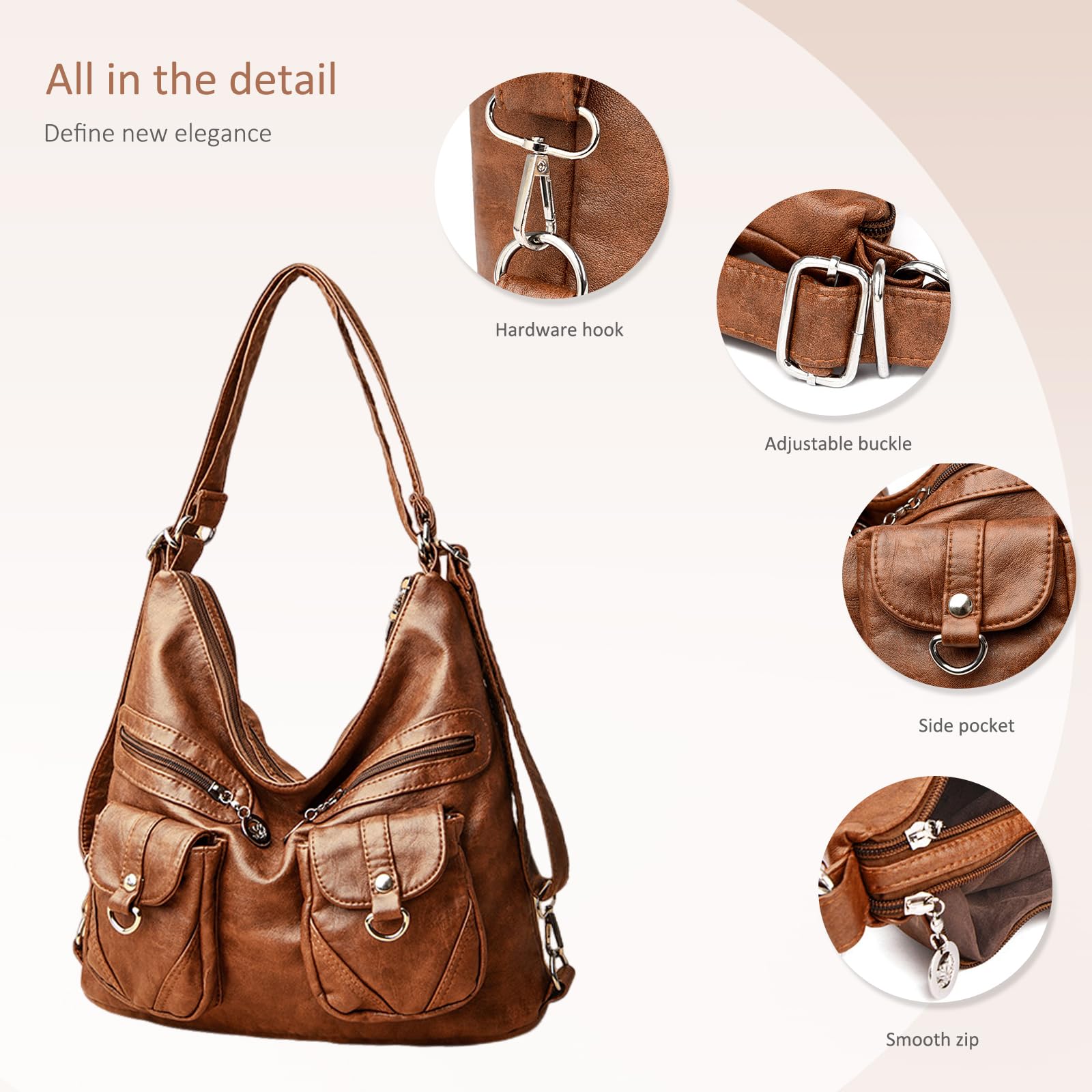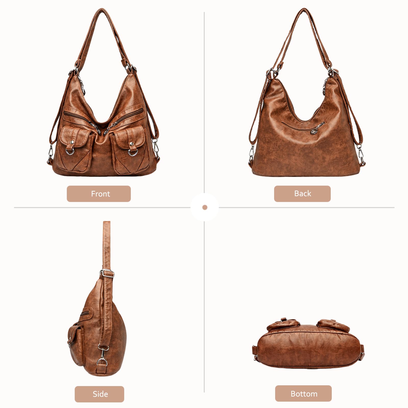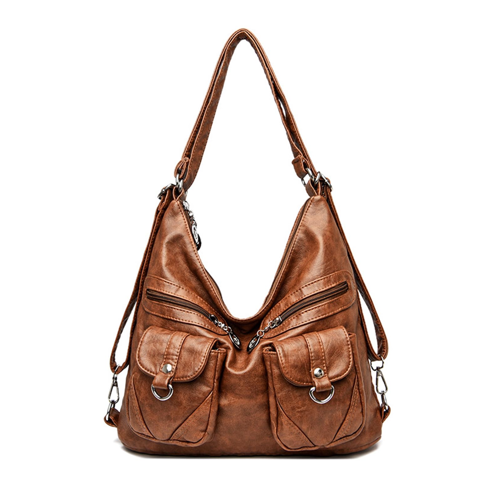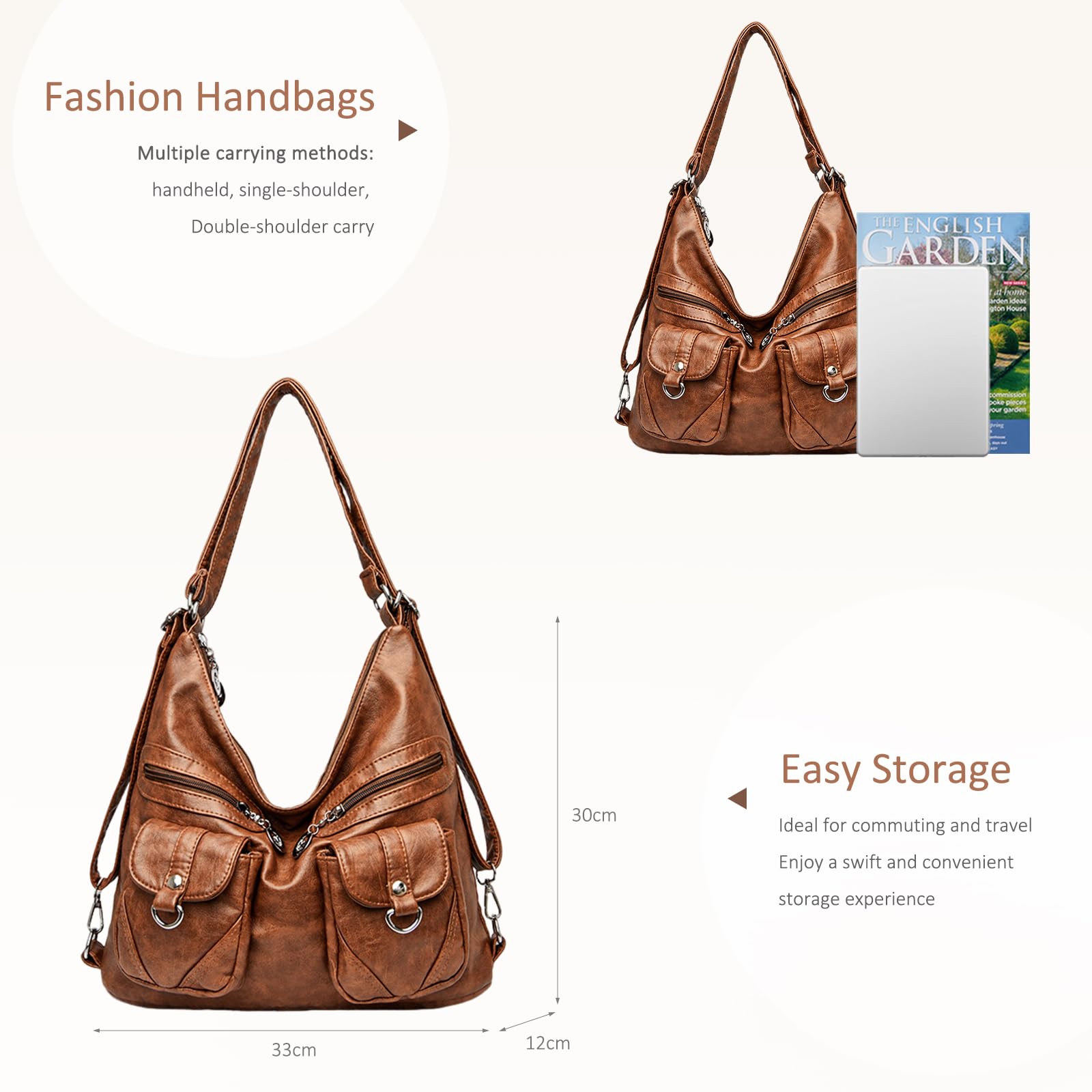 This roomy shoulder bag features a soft vintage-inspired brown finish with a relaxed hobo silhouette for an effortless everyday look. The front is designed with multiple zippered and flap pockets, adding both visual detail and practical storage for small essentials you want to keep within easy reach. Its spacious main compartment offers generous capacity for A4 magazines, books, and travel essentials, making it a reliable choice for busy workdays, shopping trips, commuting, and weekend outings. Measuring 33 x 12 x 30 cm (13″ L x 4.7″ W x 11.8″ H) and weighing only 0.57 kg, this bag is lightweight yet functional, offering comfortable all-day carrying without feeling bulky.